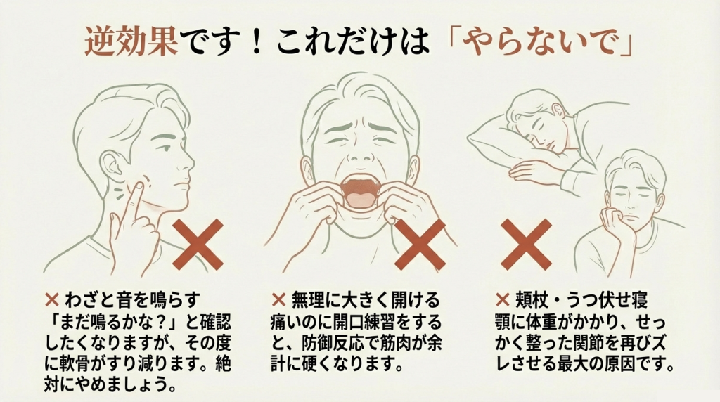 痛いのに無理に開口練習をすると、反射的に筋肉が硬くなり逆効果です。