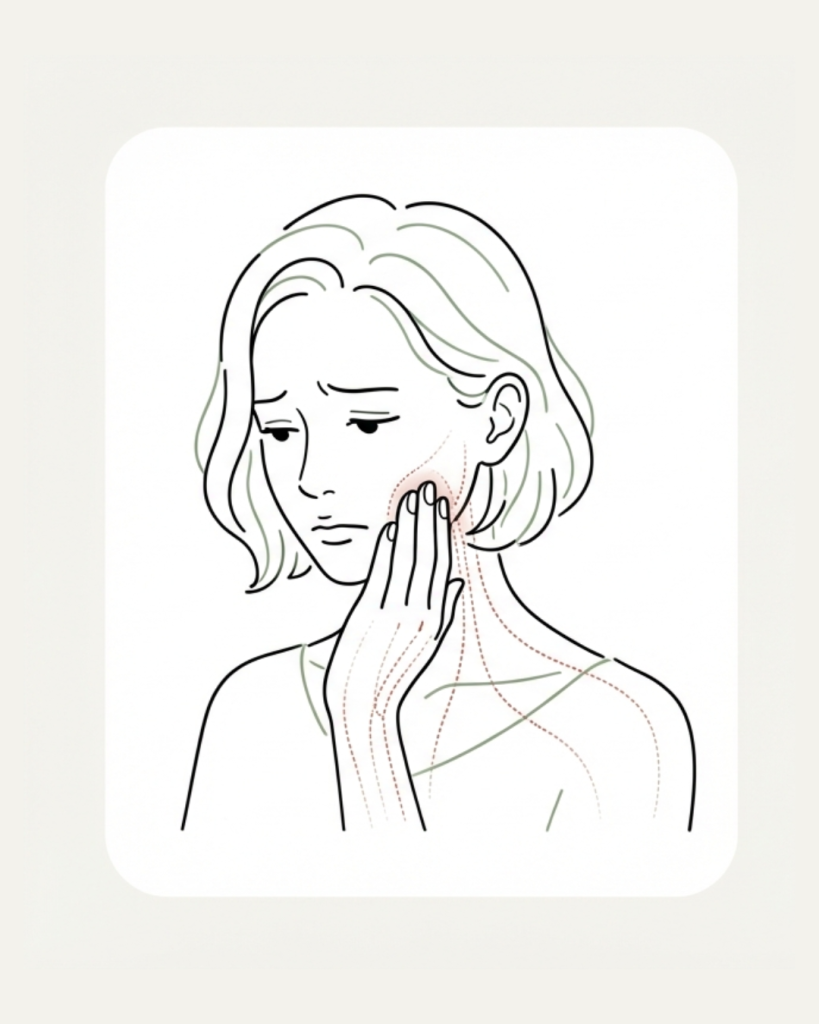デスクワーク中、口を動かしていないのに頬やこめかみが締め付けられるように痛みます。