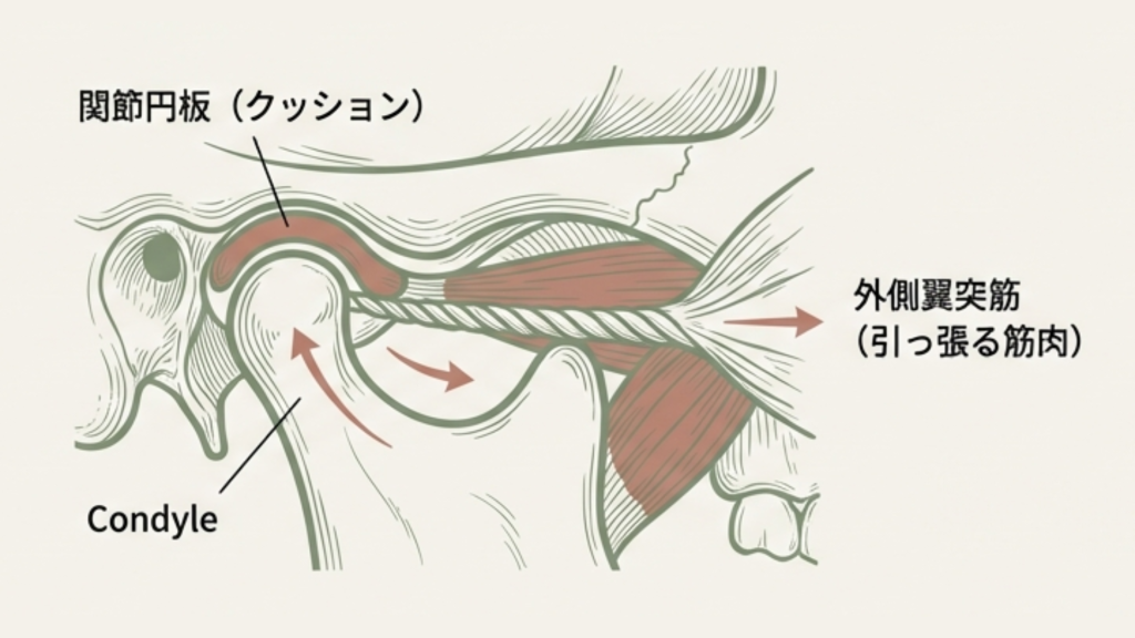 右の顎関節にあるクッション(関節円板)が前方にズレており、口を開けるたびに骨が円板に乗り上げる音(クリック音)がしていました。これを引き起こしていた犯人は、顎の奥にある外側翼突筋(がいそくよくつきん)の上頭。この筋肉が異常に緊張し、円板を無理やり前へ引っ張り続けていたのです。