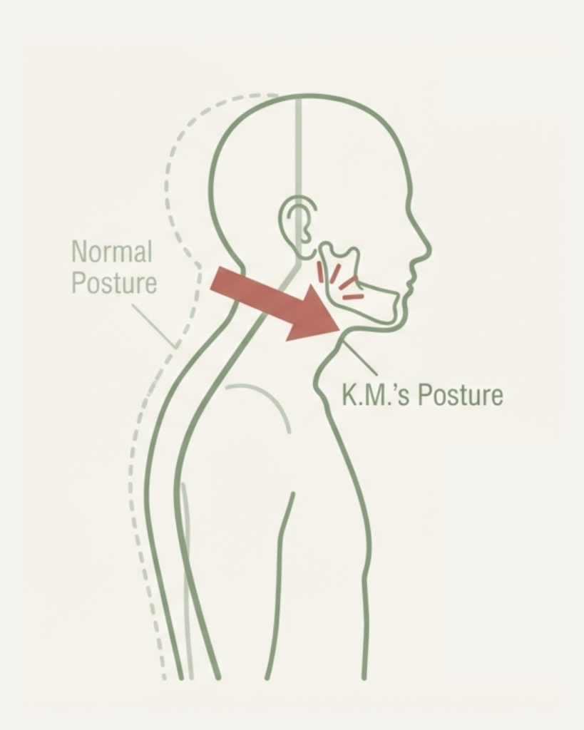 K.Mさんは典型的な猫背(頭部前方位)でした。頭が前に出ると、バランスを取るために下顎は後ろへ押し込まれます。これにより顎関節の後部組織が圧迫されていました。さらに、首の上部(第1頚椎)が右にねじれており、これが神経を介して顎の筋肉の緊張を強めていました。