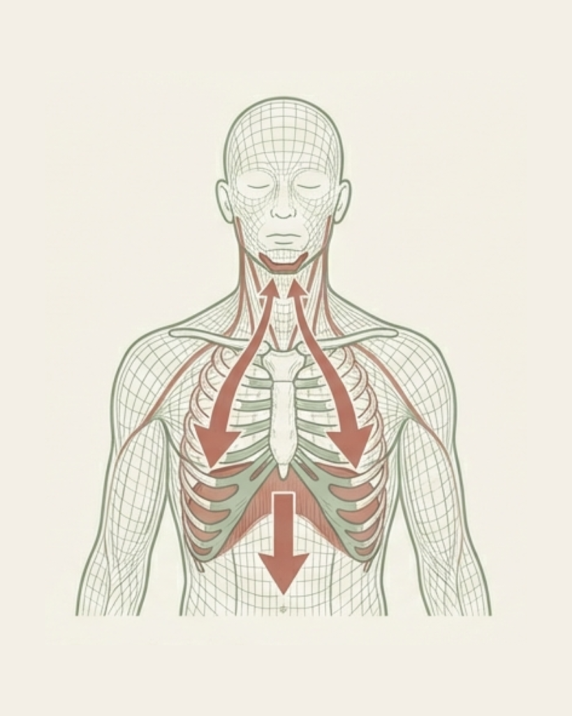 ここが盲点でした。ストレスと浅い呼吸により、横隔膜や胸の周りの筋膜がガチガチに固まっていました。この筋膜は首を通って顎の下(舌骨)まで繋がっています。つまり、呼吸が浅いために体が下方向へ縮こまり、顎を下に引っ張り続けていたのです。