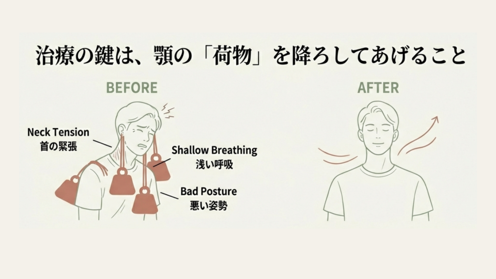 施術の目的は、顎を無理やり治すことではなく、「顎にかかっている過剰な負荷(荷物)」を一つずつ降ろしてあげることです。