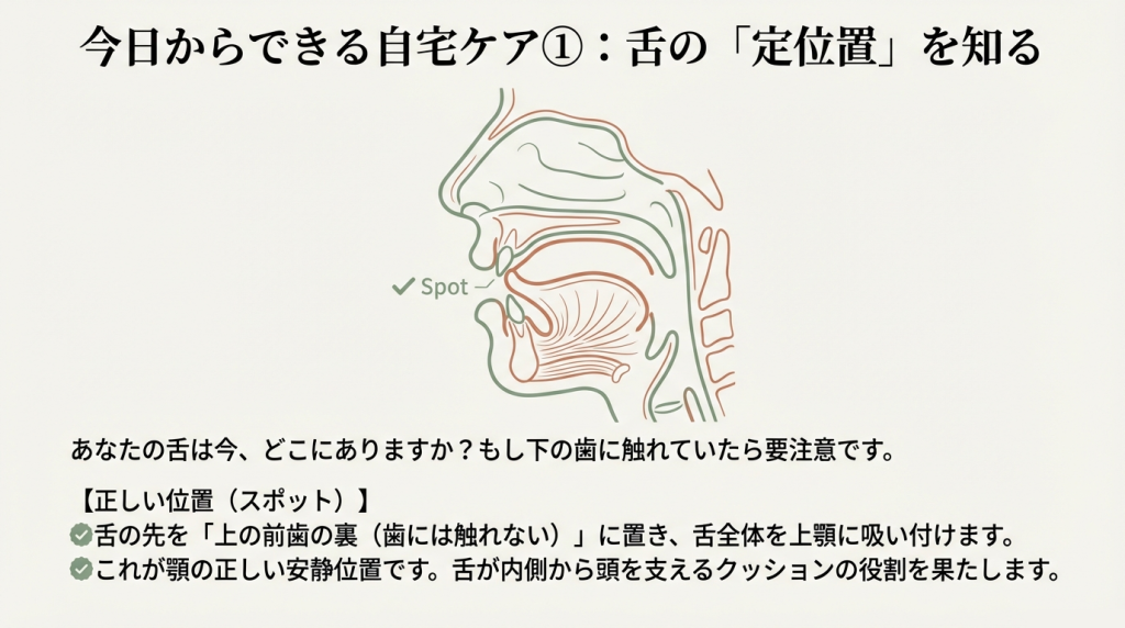 舌の先を上の前歯の裏(触れない程度)に置き、舌全体を上顎に吸い付けます(スポット)。これが顎の正しい安静位置です。